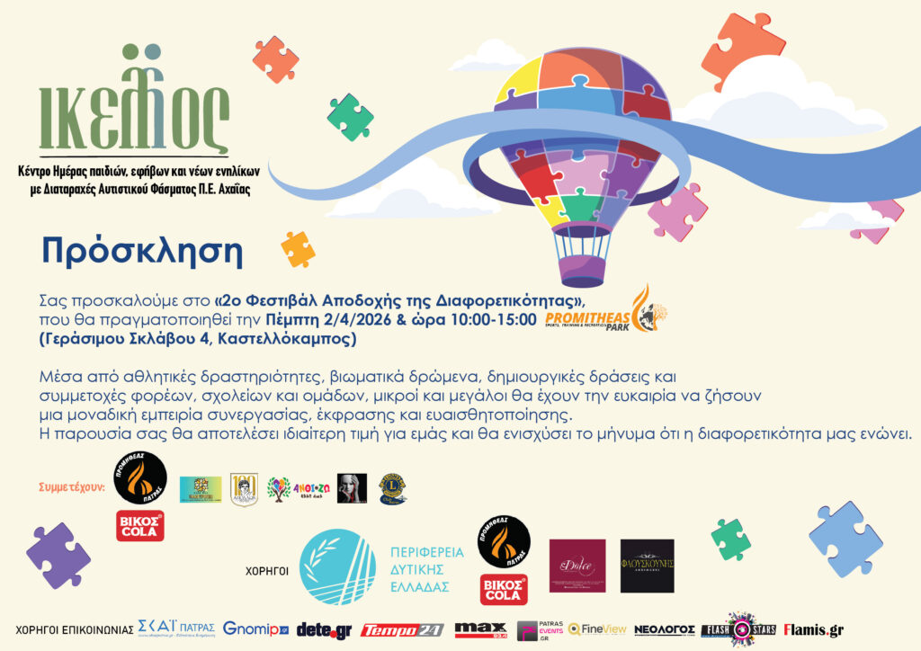 Το Σωματείο ΙΚΕΛΟΣ διοργανώνει το 2ο Φεστιβάλ Αποδοχής της Διαφορετικότητας, μια ανοιχτή εκδήλωση αφιερωμένη στη συμπερίληψη, την αποδοχή και την ενίσχυση της κοινωνικής ευαισθητοποίησης γύρω από τη διαφορετικότητα.
