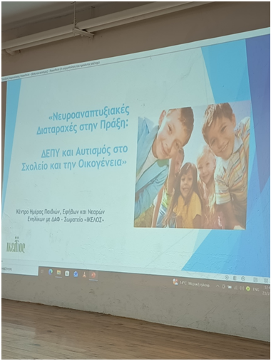 Τη Δευτέρα 23 Μαρτίου πραγματοποιήθηκε δράση ενημέρωσης από την πολυκλαδική θεραπευτική ομάδα του Κέντρου Ημέρας Παιδιών, Εφήβων και Νέων Ενηλίκων με Διαταραχές Αυτιστικού Φάσματος του Σωματείου «ΙΚΕΛΟΣ». Η δράση απευθυνόταν σε γονείς και εκπαιδευτικούς του Γυμνασίου και Λυκείου Ανδραβίδας και είχε ως στόχο την ευαισθητοποίηση και την ενίσχυση της γνώσης γύρω από τις νευροαναπτυξιακές διαταραχές.Κατά τη διάρκειά της παρουσιάστηκαν βασικά χαρακτηριστικά των διαταραχών αυτών ,προσεγγίσεις υποστήριξης των μαθητών στο σχολικό και οικογενειακό περιβάλλον, καθώς και πρακτικές κατευθύνσεις για την αποτελεσματικότερη διαχείριση καθημερινών προκλήσεων. Ακολούθησε συζήτηση με το κοινό, δίνοντας τη δυνατότητα για ανταλλαγή απόψεων και εμπειριών.Η ενεργή συμμετοχή των παρευρισκόμενων ανέδειξε τη σημασία της συνεργασίας μεταξύ οικογένειας, σχολείου και εξειδικευμένων υπηρεσιών για την ολιστική υποστήριξη παιδιών και εφήβων με διαταραχές αυτιστικού φάσματος.