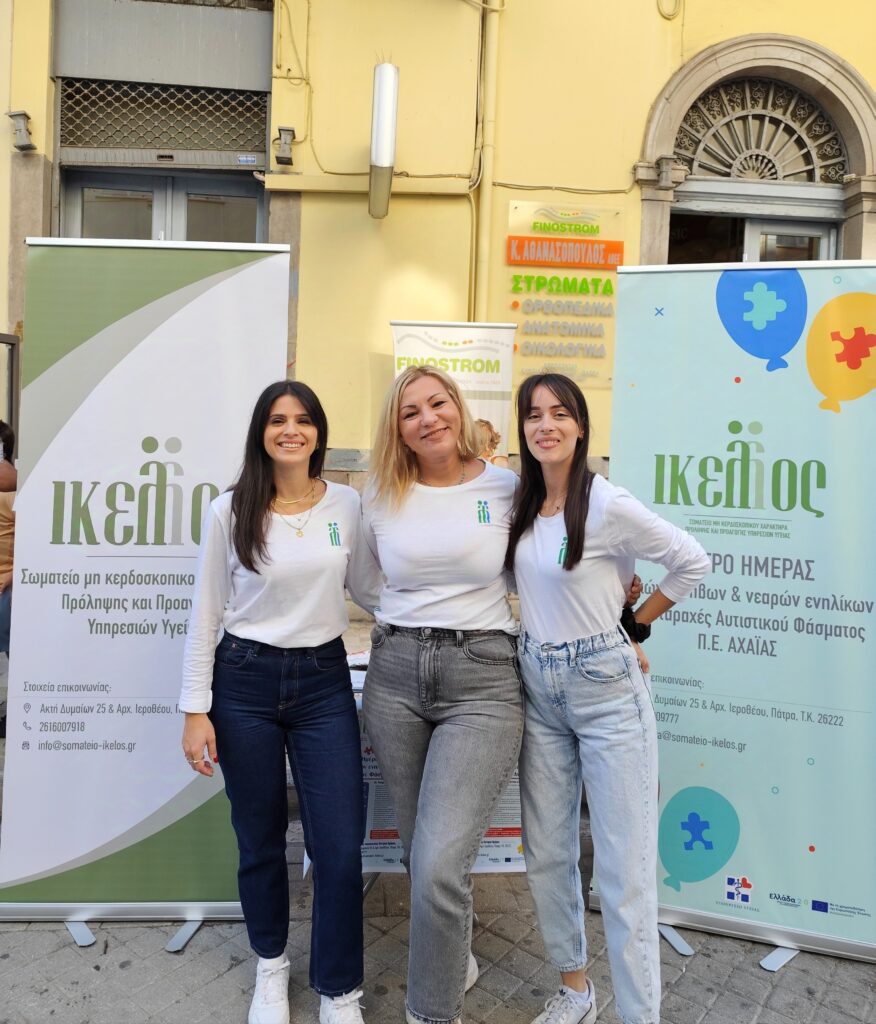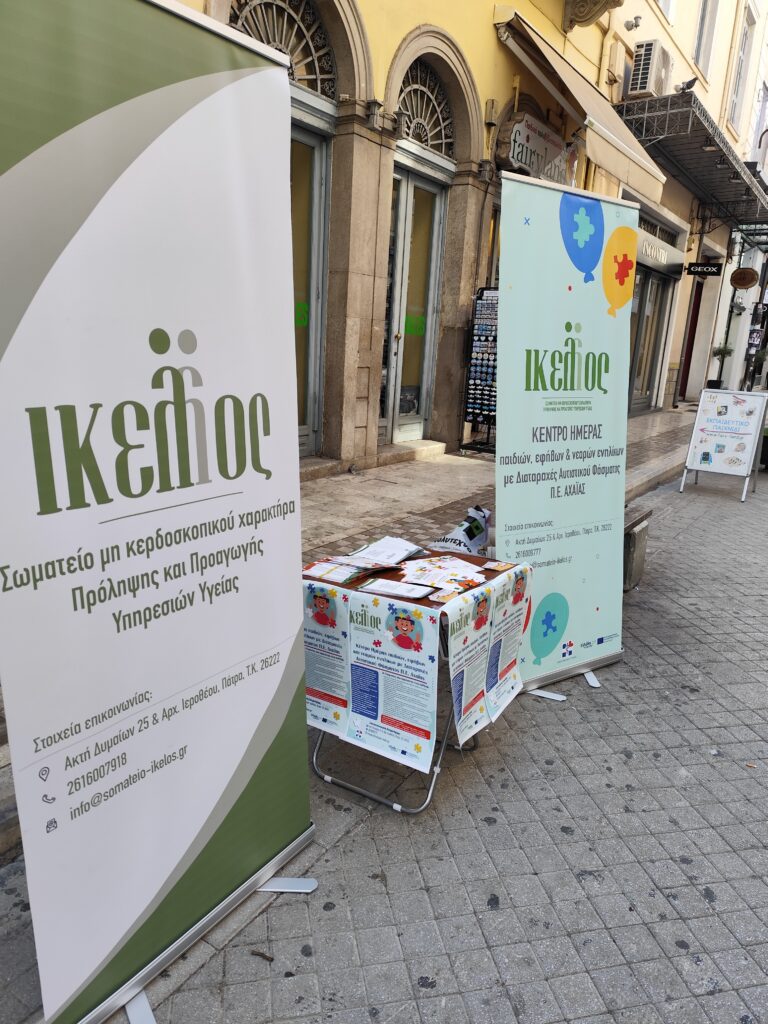 Την Δευτέρα, 14 Οκτωβρίου 2024 πραγματοποιήθηκε Ενημερωτική Δράση στην Κοινότητα στο κέντρο της Πάτρας σχετικά με την έναρξη και τη λειτουργία του Κέντρου Ημέρας παιδιών, εφήβων και νεαρών ενηλίκων με Διαταραχές Αυτιστικού Φάσματος Π.Ε. Αχαΐας του Σωματείου ΙΚΕΛΟΣ. Αναλυτικότερα, η Διεπιστημονική Ομάδα ενημέρωσε το κοινό μέσω της διανομής φυλλαδίων για το έργο και τις παρεχόμενες υπηρεσίες του Κέντρου Ημέρας στα ωφελούμενα άτομα με ΔΑΦ καθώς και στις οικογένειές τους. Ιδιαίτερη αναφορά έγινεστον στόχο του Κέντρου Ημέραςπου αφορά στην ψυχοκοινωνική αποκατάσταση και κοινωνική ένταξη των ατόμων με ΔΑΦ υπό την στήριξη της πολυκλαδικής θεραπευτικής του ομάδας.