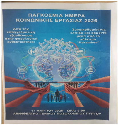 Την Τρίτη 17 Μαρτίου, με αφορμή την Παγκόσμια Ημέρα Κοινωνικής Εργασίας, πραγματοποιήθηκε στο Νοσοκομείο Πύργου μια σημαντική συγκέντρωση όλων των κοινωνικών λειτουργών του νομού, με θεματικό άξονα «Από την επαγγελματική εξουθένωση στην ψυχολογική ανθεκτικότητα: συνοικοδομώντας ελπίδα και αρμονία μέσα από το κάλεσμα “Harambee”». Η συνάντηση αυτή αποτέλεσε μια ουσιαστική ευκαιρία για ανταλλαγή εμπειριών, προβληματισμών και καλών πρακτικών, αναδεικνύοντας τον καθοριστικό ρόλο της κοινωνικής εργασίας στην υποστήριξη των ευάλωτων ομάδων και την ενίσχυση της κοινωνικής συνοχής.