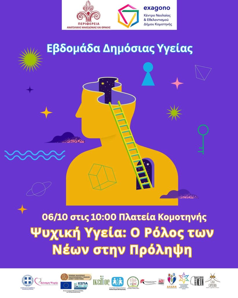 Το Οικοτροφείο Κομοτηνής του Σωματείου «ΙΚΕΛΟΣ» συμμετέχει στην εκδήλωση Ψυχική Υγεία: Ο Ρόλος των Νέων στην Πρόληψη» που διοργανώνει το Κέντρο Νεολαίας και Εθελοντισμού Exagono, στο πλαίσιο της Εβδομάδας Δημόσιας Υγείας. Η εκδήλωση θα πραγματοποιηθεί τη Δευτέρα, 6 Οκτωβρίου, στην Πλατεία Ειρήνης, από τις 10:00 έως τις 14:00.